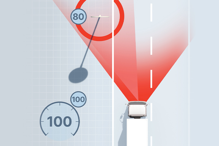 The ADAS’ camera recognises particular traffic signs, including speed limit signs, and informs the driver by displaying them on the dash instrument panel.